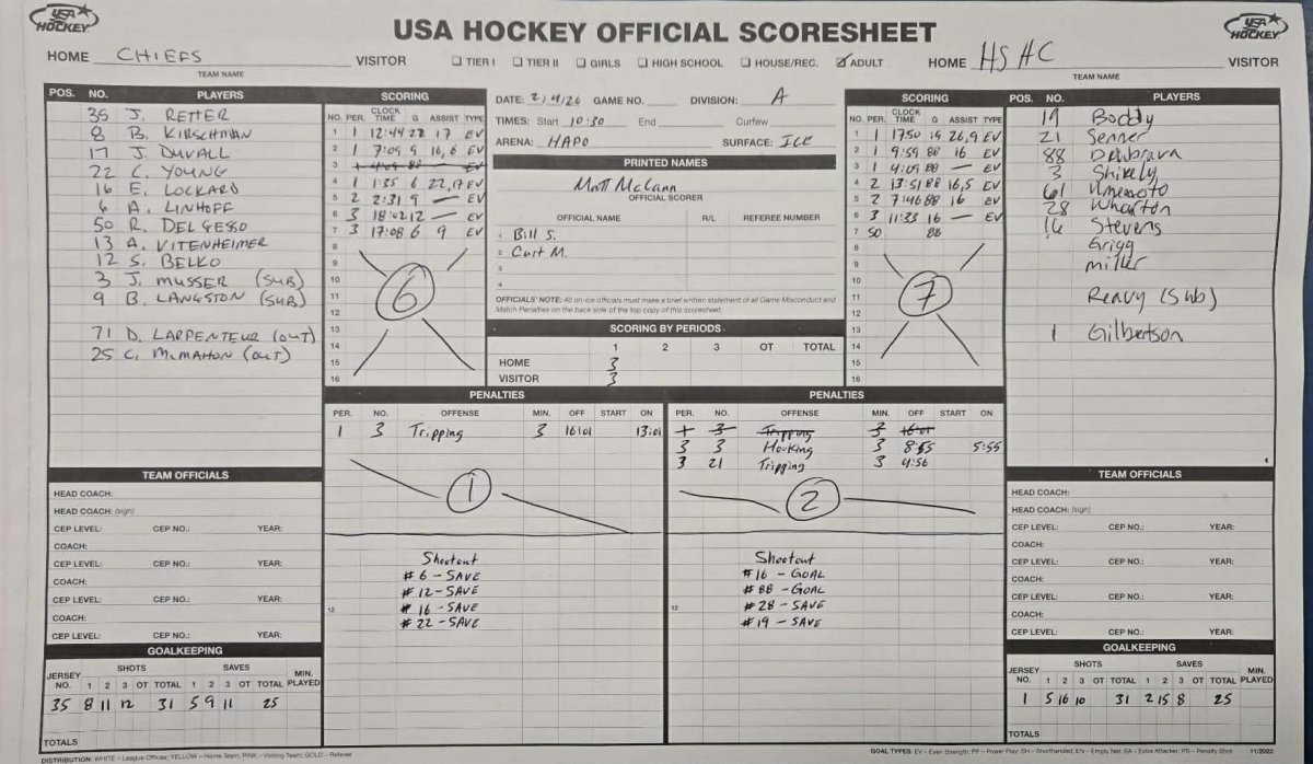 2026-02-04 10:30 PM Hockey Source Chiefs Hapo Ice Pavillion Matt McCann 7 - 6 SO