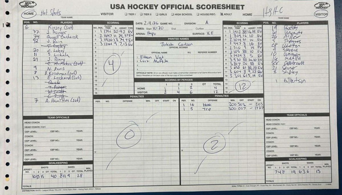 2026-02-11 10:30 PM Hotshots Hockey Source Hapo Ice Pavillion Jakob Carlson 4 - 12